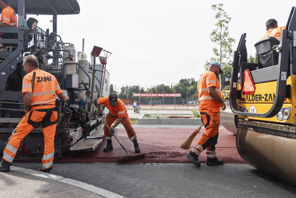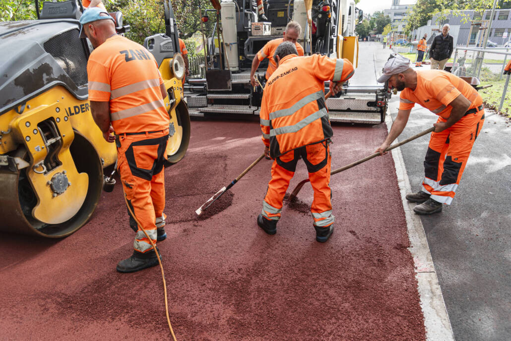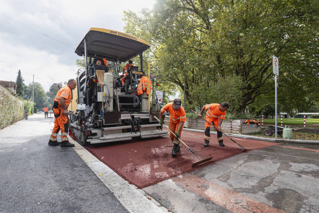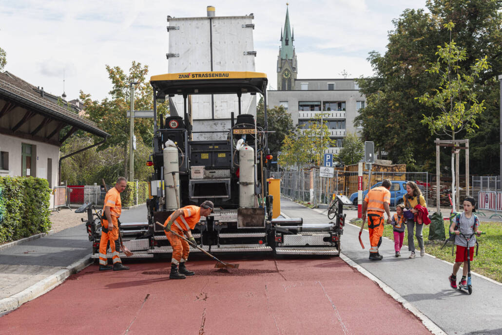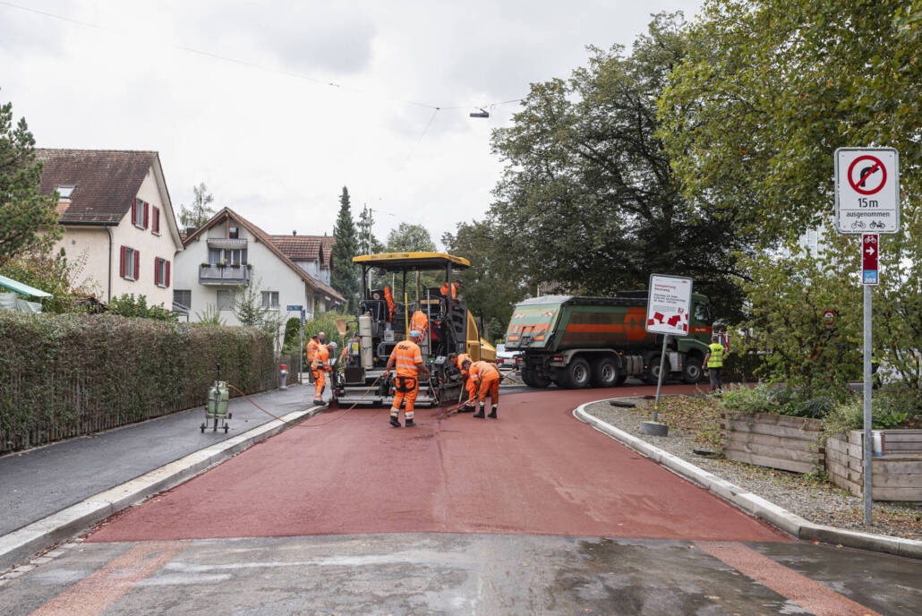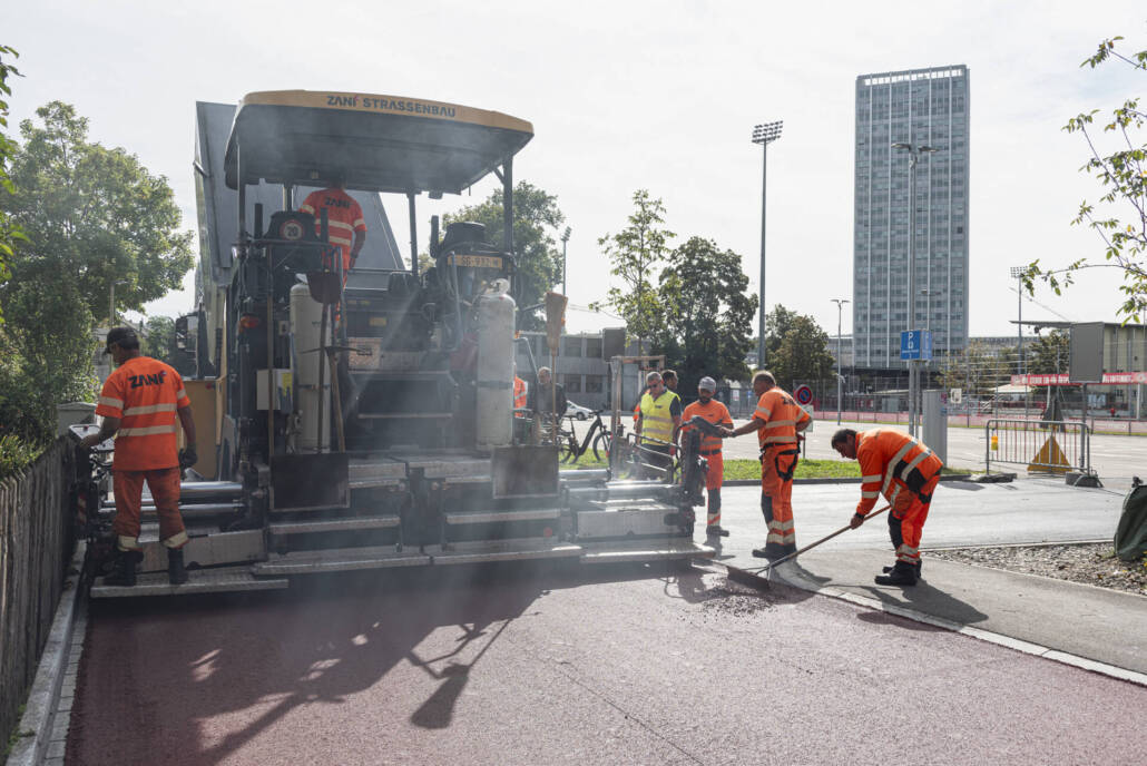 Neuerstellung, Stadt Winterthur, Einbau des roten Walzbelags und der Veloroute in Betrieb mit Markierung, September 2024