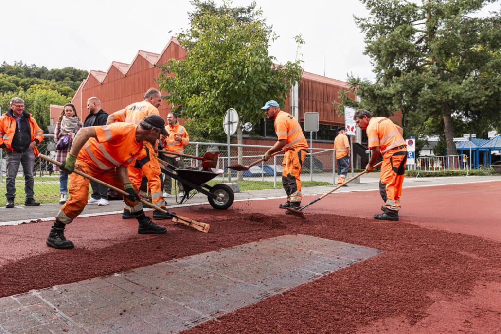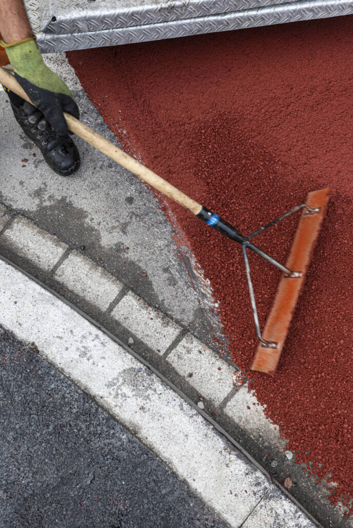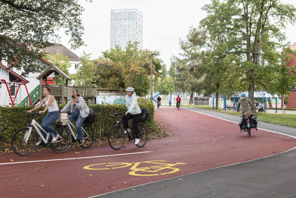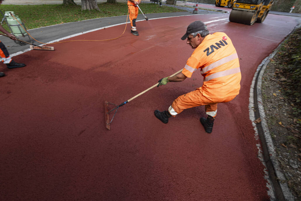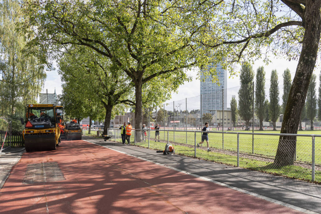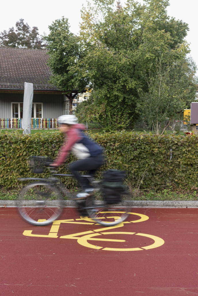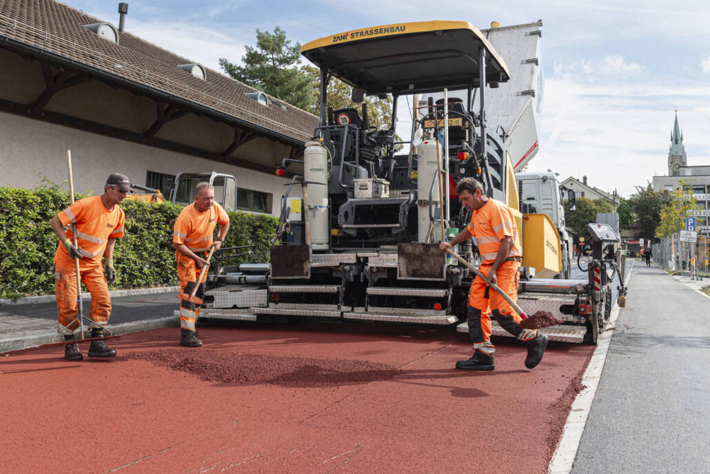 Neuerstellung, Stadt Winterthur, Einbau des roten Walzbelags und der Veloroute in Betrieb mit Markierung, September 2024